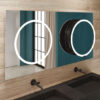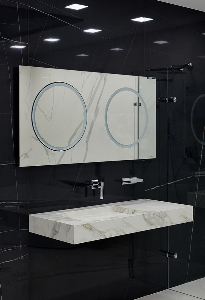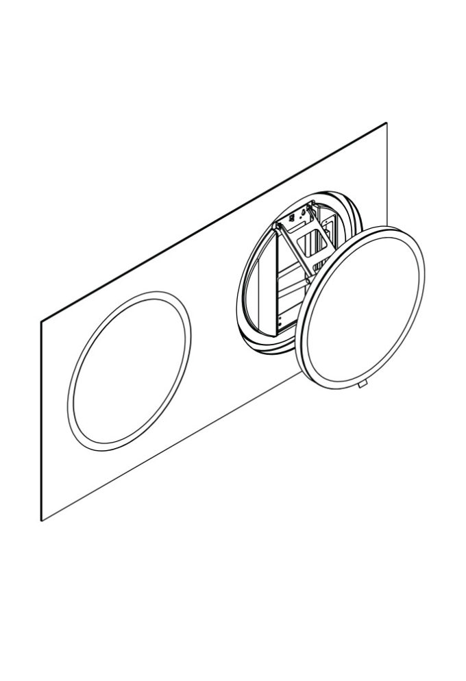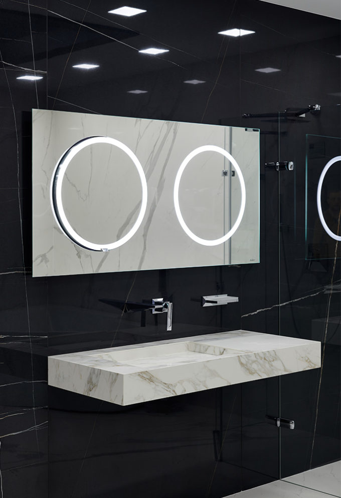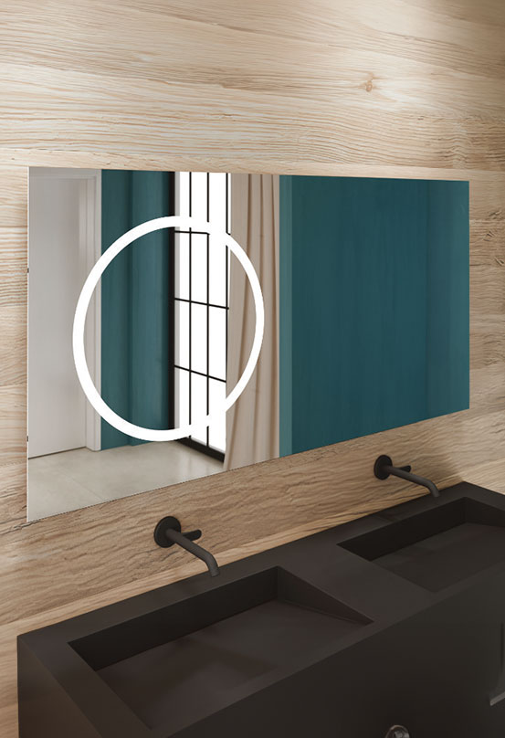 Wyjątkowe, duże i bardzo płaskie lustro z modułem wysuwnym o średnicy 50 cm, automatycznie włączanym oświetleniem LED oraz mechanizmem wysuwnym AXIO-SLIM® w kolorze czarnym.