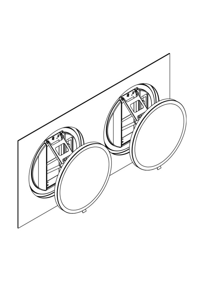 Wyjątkowe, duże i bardzo płaskie lustro z dwoma modułami wysuwnymi o średnicy 50 cm każdy, automatycznie włączanym oświetleniem LED oraz mechanizmem wysuwnym AXIO-SLIM® w kolorze czarnym.