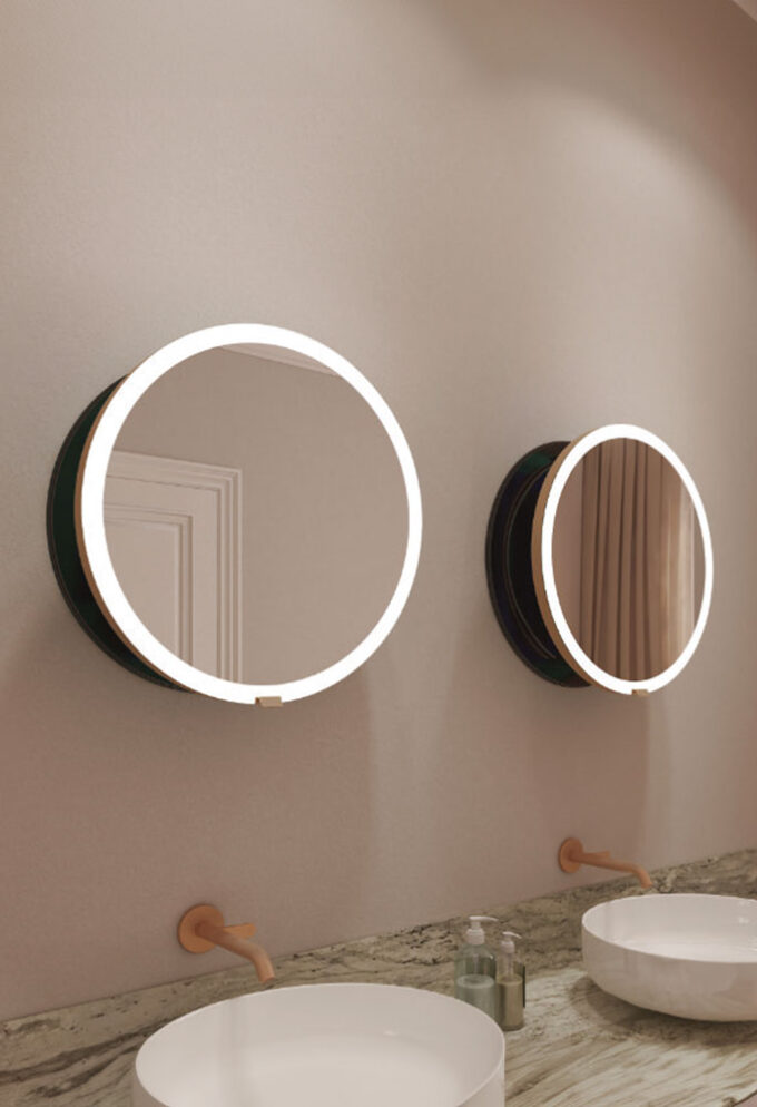 Przełomowe, bardzo płaskie lustro wysuwane o średnicy 50 cm, z oświetleniem LED i mechanizmem wysuwnym AXIO-SLIM®.